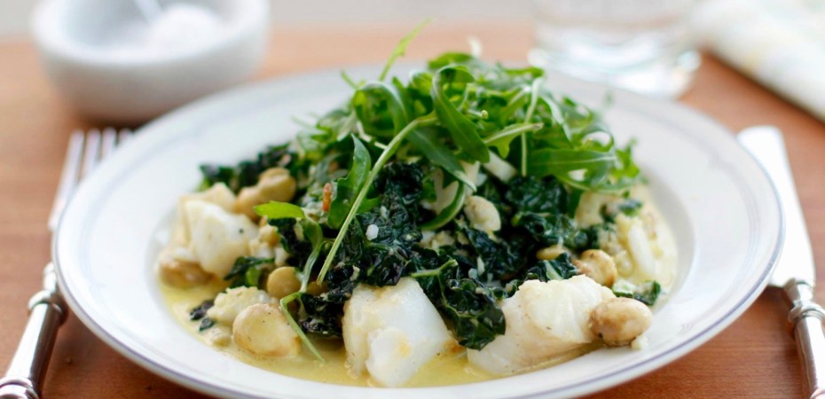 Þá bætti ég 150 ml af rjóma á pönnuna, ásaamt hálfri dós af niðursoðnum baunum – ég notaði grænar límabaunir en það má t.d. nota cannellini-baunir eða hvaða ljósar baunir sem er. Lét þetta malla við vægan hita í 2-3 mínútur, eða þar til fiskurinn var rétt eldaður í gegn og baunirnar heitar. Hrærði gætilega í, smakkaði og bragðbætti með pipar og salti eftir þörfum.