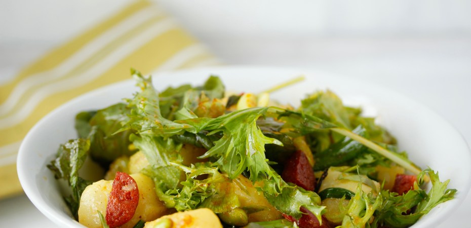 Þetta er kartöflusalat sem getur sem best verið máltíð í sjálfu sér en líka meðlæti með ýmsum réttum. Sleppa má chorizopylsunni til að gera salatið vegan og krydda þá salatið meira í staðinn. Í staðinn fyrir edamamebaunir má nota t.d. strengjabaunir og þá er nóg að skera þær í bita í stað þess að taka baunirnar úr belgjunum.