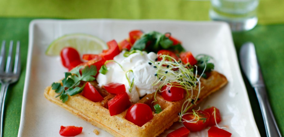 Þessar krydduðu vöfflur eru gerðar úr blöndu af heilhveiti og maísmjöli. Áleggið hér er með frísklegum, svolítið mexíkóskum blæ en raunar má setja alls konar álegg á þær.