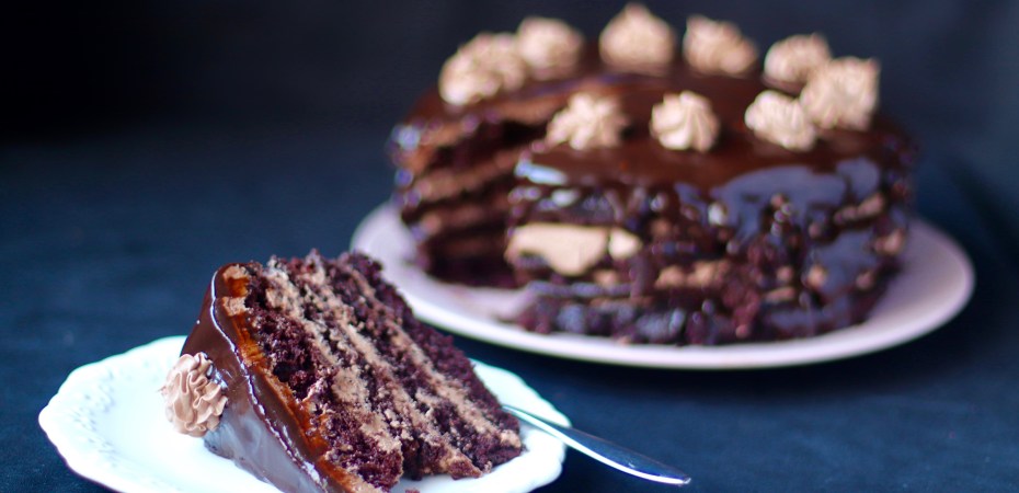 Í henni eru fjórir botnar og það er langbest að baka þá hvern fyrir sig; auðvitað má baka tvo þykka botna og kljúfa þá en hætt er við að þeir molni of mikið. Deigið þolir ekki að bíða mjög lengi og mér finnst best að gera það í tveimur skömmtum og baka tvo botna í einu. En bökunartíminn er þó svo stuttur að ef maður á ekki tvö jafnstór form ætti að vera í lagi að gera hálfan skammt af deiginu, baka í tvennu lagi og endurtaka þetta svo. Svolítil fyrirhöfn en borgar sig alveg.