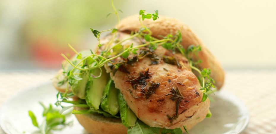 Svo tók ég tvö lítil, vel þroskuð avókadó, flysjaði þau og og steinhreinsaði og skar þau í sneiðar. Setti bolluhelminga eða brauðsneiðar á diska eða fat og setti klettasalat og avókadó ofan á. Skar hverja kjúklingabringu í tvennt á þykktina og setti báða helmingana ofan á avókadóið. Svo setti ég 1 msk af kryddjurtamauki ofan á, lagði efri bolluhelminginn ofan á og skreytti með timjani (eða öðrum ferskum kryddjurtum).