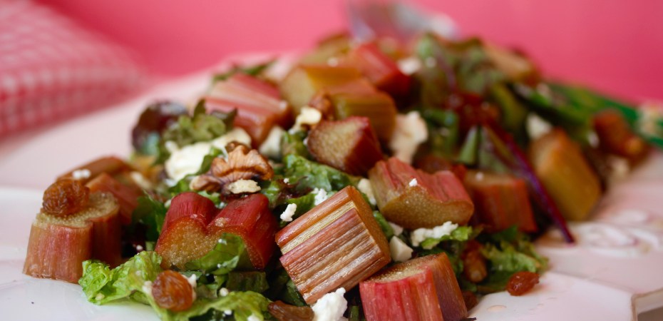 Rabarabari er fullsúr til að nota hann alveg hráan í salat en það er heldur ekki gott að elda hann svo mikið að hann fari að linast að ráði, þá fer hann bara í mauk og það er ekki sniðugt. Ekki í salati. Svo að ég hálfbakaði hann. – Það er alveg hægt að gera þetta á öðrum árstímum og nota frosinn rabarbara en þá er eiginlega enn mikilvægara að baka hann ekki of lengi.