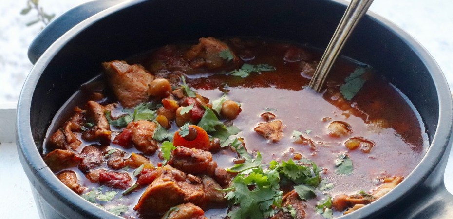 Svo að það er kominn tími á vel kryddaða og yljandi súpu. Til dæmis kjúklingasúpu eins og þessa hér, sem ég gerði fyrir MAN í fyrra. Hún er matarmikil og getur reyndar alveg eins verið pottréttur – þá má bara nota aðeins minna vatn og bera hana svo fram t.d. með kúskúsi eða hrísgrjónum.