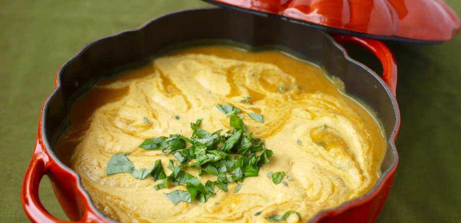 Það er líka engifer og karrí í henni og hún ætti að duga ágætlega við kvefi. Það má alveg nota minna af kasjúhnetumaukinu eða jafnvel sleppa því (súpan verður aðeins þynnri og ekki eins mjúk en bragðið er fínt) eða nota til dæmis sýrðan rjóma. En þetta kom alveg ljómandi vel út svona.