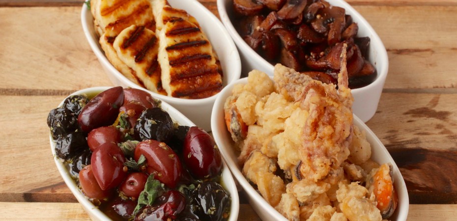 Þarna er grillaður halloumi-ostur, rauðvínssteiktir sveppir, ólífur með óreganó og hvítlauk og steikt sjávarréttablanda.
