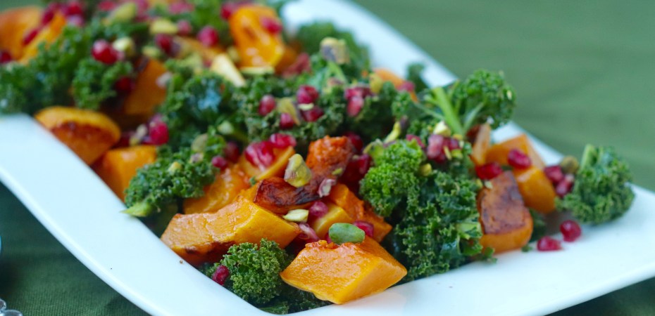 Uppskriftin hér á eftir er ekki úr bókinni en hefði alveg getað verið þar með ákveðnum breytingum. Uppistaðan er butternut og grænkál og ég bakaði bara butternutið en hefði svo sem alveg getað saxað það og bakað það með síðustu mínúturnar til að mýkja það. Ég kaus hins vegar fremur að nudda það í sama tilgangi, þar með varð rétturinn kannski salatlegri (frísklegri allavega, en bragðið er hreint ekki síðra ef grænkálið er bakað).
