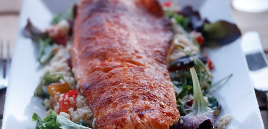 Ég byrjaði á að hita pönnuna (reyndar notaði ég ílangt steypujárnsmót en flestir myndu nú bara nota pönnu) og kryddaði bleikjuna með reyktri papriku (má nota venjulega), pipar og salti. Ég setti líka 150 ml af kúskús í skál og hellti yfir sjóðandi vatni í samræmi við leiðbeiningar á umbúðum, setti disk/lok yfir og lét standa í nokkrar mínútur.