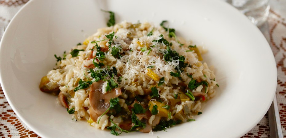Þetta er svepparisotto svo að auðvitað eru sveppir. En það má líka sleppa þeim og nota eitthvað annað … Ég fékk fyrir skömmu þurrkaða kóngssveppi gefins (norður-ítalska, frá konu sem var þar á skíðum – en það var í janúar) og þeir gefa ansi mikið bragð svo að ég tók fáeina, setti þá í skál, hellti dálitlu heitu vatni (svona 100 ml) yfir og lét standa í hálftíma.