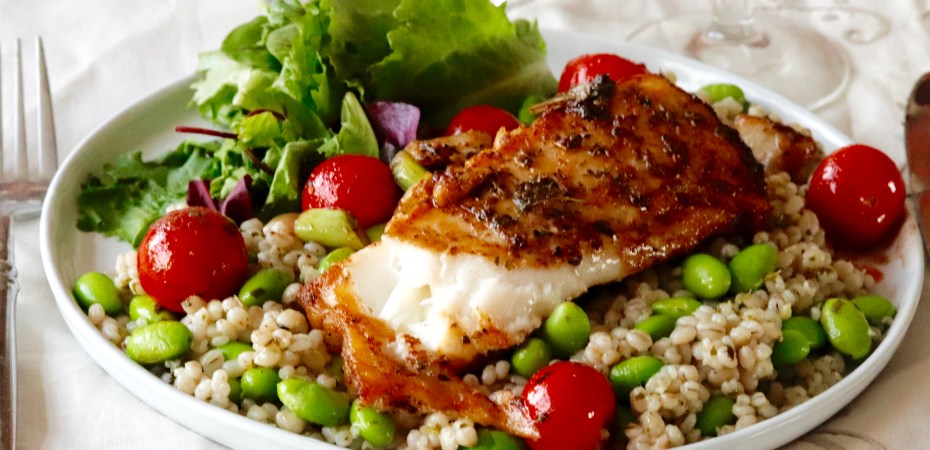 Pönnusteikt langa með perlubyggi og edamamebaunum