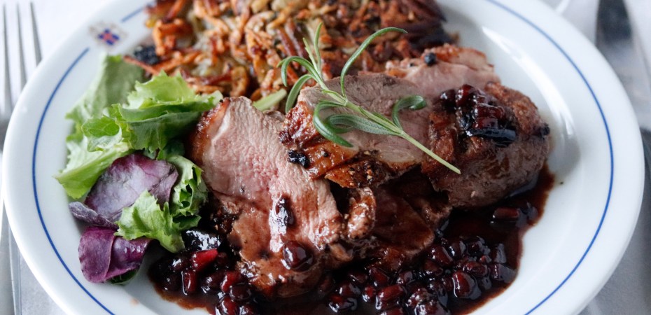 Andarbringa með jarðskokkalummum og Madeira-balsam-granateplafræjasósu