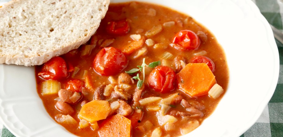 Núna ákvað ég að elda eitthvað sem er meiri hversdagsmatur og kannski meira í takt við það sem margt fólk sér fyrir sér þegar það hugsar um eldamennsku í sóttkví – geymsluþolið grænmeti, niðursuðuvörur, engar mjólkurvörur eða neitt slíkt. Ekki vegna þess að ég sé orðin uppiskroppa með allt hitt, öðru nær. En mig langaði hvorki í kjöt né fisk svo að ég ákvað að elda grænmetis- og baunasúpu. Já, hún er meira að segja vegan ef út í það fer.