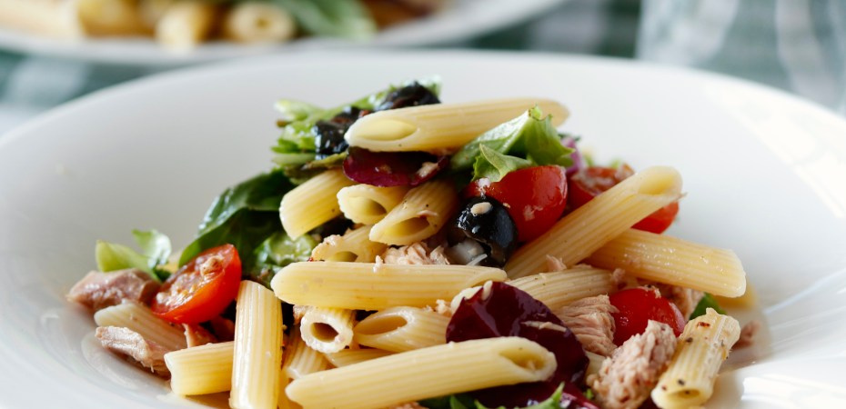 Túnfisk-pastasalat með tómötum, ólífum og kapers