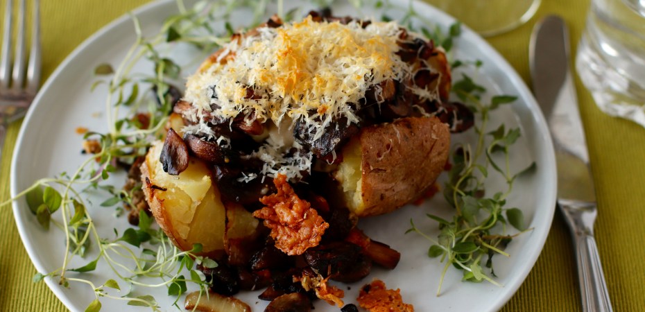 Ég tók kartöfluna út þegar hún var meyr (stakk teini í hana til að kanna það) og lét hana bíða í fáeinar mínútur. Hækkaði á meðan ofnhitann í 225°C. Skar svo djúpan kross ofan í hana og þrýsti á hýðið til að opna krossinn. Ég var með 40 g bita af osti sem ég hafði skorið í litla teninga og setti þá ofan í krossinn, stakk svo forminu aftur í ofninn og bakaði í um 5 mínútur, eða þar til osturinn var byrjaður að bráðna.