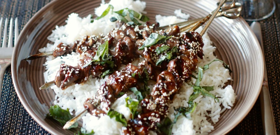 Hellti 3 msk af teriyakisósu yfir og reif dálítinn bita af engifer og einn hvítlauksgeira fínt yfir, blandaði vel og lét þetta standa í svona klukkutíma. Þá tók ég hjörtun og þræddi þau á nokkra grillpinna; stakk þeim í gegnum hjörtun þannig að þau yrðu sem flötust og þynnst.
