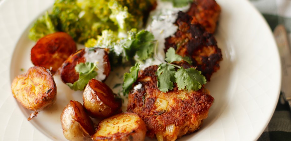 Ég var búin að sjóða fáeinar litlar kartöflur og ögn af spergilkáli. Skar kartöflurnar í tvennt og steikti þær á pönnunni með túnfiskbuffunum.
