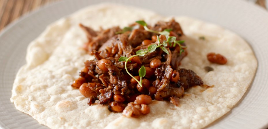 Ég setti andarlærið á disk og lét rjúka úr því í nokkrar mínútur, áður en ég tók kjötið af beinunum og tætti það sundur með tveimur göfflum. Á meðan það beið setti ég pönnuna á eldavélarhellu, hrærði hálfri dós af borlotti-baunum (eða einhverjum öðrum baunum) og tveimur matskeiðum af hoisin-sósu saman við og lét malla aðeins.