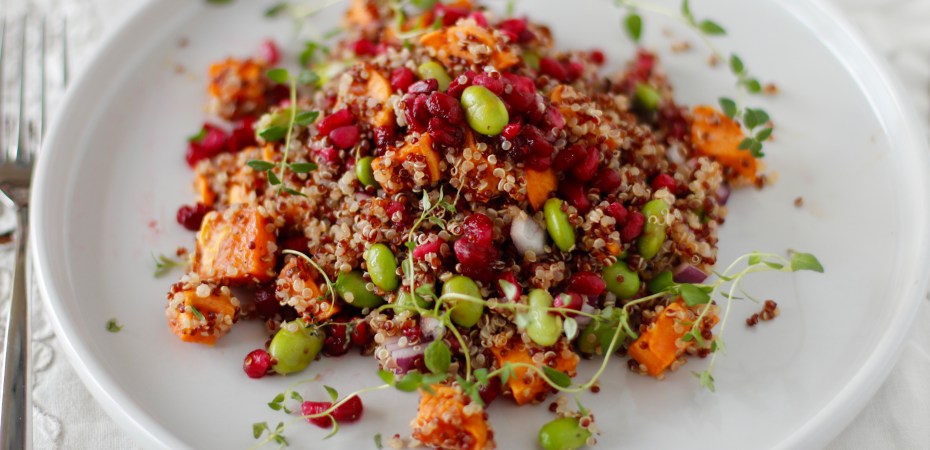 Kínóasalat með sætum kartöflum, edamamebaunum og granateplafræjum