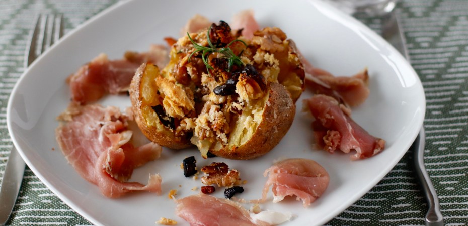 Bökuð kartafla með Stiltonosti og valhnetum (og hráskinku)
