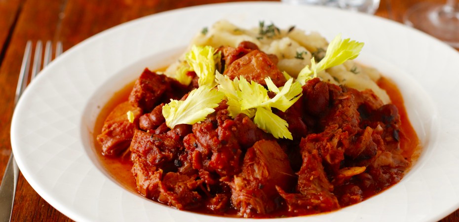 Ég skar svo kjötið í bita, setti það út í baunakássuna og lét malla í a.m.k. 10 mínútur – má alveg vera lengur. Smakkaði sósuna og bragðbætti hana eftir þörfum. Ef hún er mjög þunn má þykkja hana aðeins með sósujafnara.