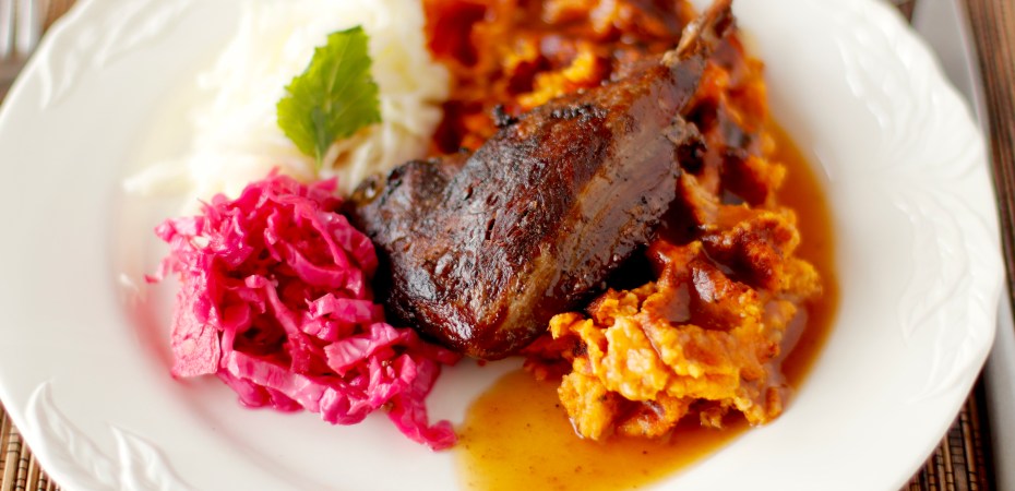 Skarfslæri á sætkartöfluvöfflu með snöggsýrðu rauðkáli