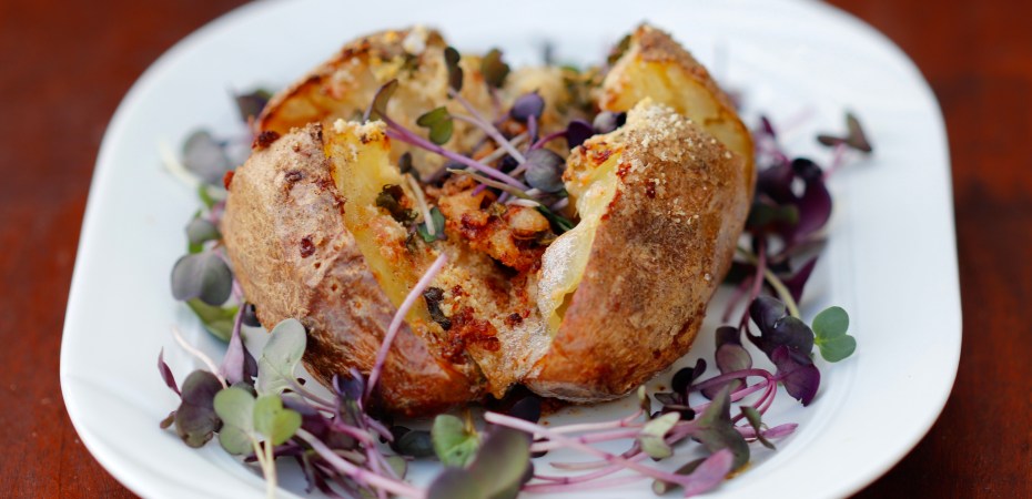 Ég muldi ostinn ofan í kartöflukrossinn, kannski 2-3 matskeiðar. Svo af því að ég átti nú slatta af sprettum stráði ég dálitlu af sinnepssprettum yfir – en það er líka mjög gott að nota t.d. smátt saxaðar rósmarínnálar. Ofan á þetta stráði ég svo 2-3 matskeiðum af parmesanosti. Ég var búin að hita ofninn upp í 225 gráður og setti kartöfluna aftur í hann í 12-15 mínútur, eða þar til parmesanosturinn var bráðinn og farinn að taka góðan lit.