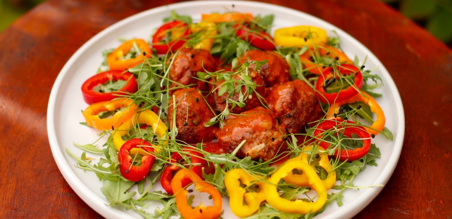 Á meðan bollurnar mölluðu í sósunni skar ég niður þrjár litlar paprikur (má líka nota eina stærri, eða bita af þremur mismunandi litum paprikum). Ég dreifði klettasalati í hring á disk (hafði eyðu í miðjunni og dreifði paprikunum yfir það. Þegar bollurnar voru tilbúnar setti ég þær í miðjuna (ekki allar, skildi eftir í nesti fyrir morgundaginn), hellti sósu yfir og stráði svo kóríandersprettum yfir allt saman. (Nú, eða kóríanderlaufi.)